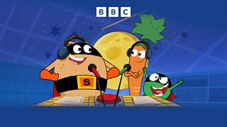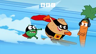 Evil Pea tricks Supertato and Carrot into a toy rocket and blasts them into space!