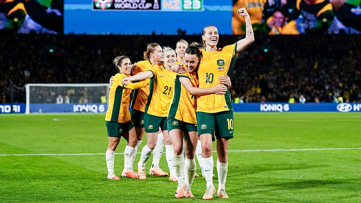 Image: Hayley Raso (L) and Emily Van Egmond of Australia (R) celebrates with her teammates after winning Denmark during the FIFA Women's World Cup Australia & New Zealand 2023 Round of 16 match between Australia and Runner Up Group D at Stadium Australia. (Photo by Daniela Porcelli/Eurasia Sport Images/Getty Images)