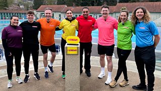 Leah, Lloyd, Jed, Huw, Gareth a Luke sy'n cystadlu yn yr her nesaf - y naid hir. Next i...