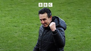 Villa boss Unai Emery reacts to comeback win against West Ham.