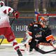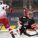 Sheffield Steelers netminder Matt Greenfield speaking to Peter Spencer, after their 4-1 Challenge Cup win over Cardiff Devils.
