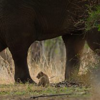 Tiny lion cubs try to avoid giant elephants
