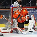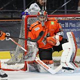Sheffield Steelers netminder Matt Greenfield speaking to Peter Spencer, after his first shutout of the season in their 5-0 win over Manchester Storm.