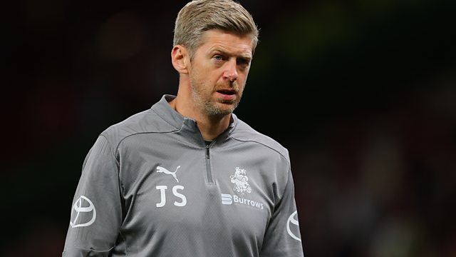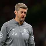 Assistant Head Coach Jon Stead talks to Josh Perkins after Bristol Rovers beat Cambridge United on penalties in the EFL Trophy.
