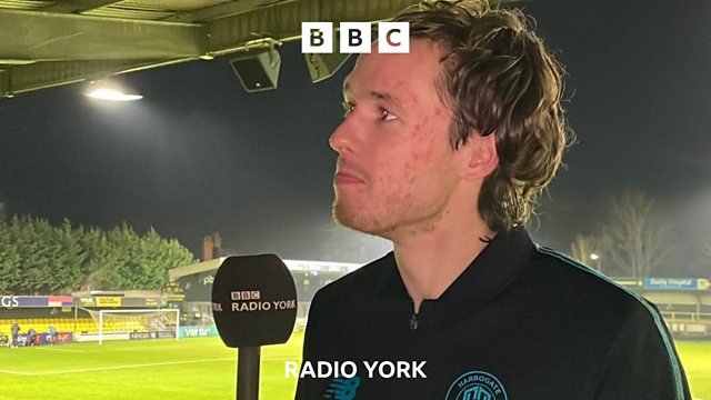 Harrogate Town winger Reece Smith speaking to Tim Steere after scoring in their 4-2 win against Blackpool in the EFL Trophy.
