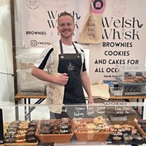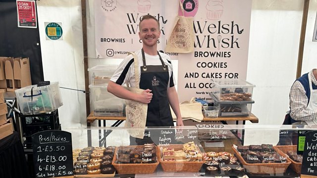 Dafydd Williams, perchennog busnes cacennau Welsh Whisk yn sôn am sut wnaeth ddechrau'r busnes fel hobi ac yna'n gadael ei swydd fel athro i bobi'n llawn amser