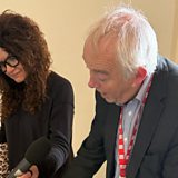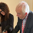 Will Troughton sy'n tywys Ffion trwy gasgliad ffotograffau rhyfel Geoff Charles.