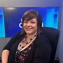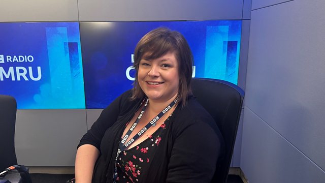 Yr ieithydd Sarah Cooper sy'n sgwrsio gydag Aled.
