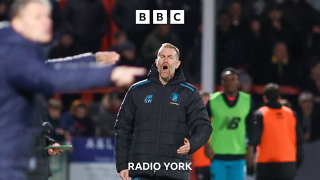 Harrogate Town manager Simon Weaver speaks to Tim Steere after a 4-0 defeat against Milton Keynes Dons.