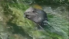 A beaver sits down to eat in the midst of a fast flowing stream