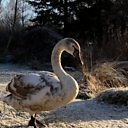 Mute swans journey through a frozen landscape