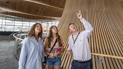 Hana Medi, Cynan Anwyl a'r gohebydd Ian Mitchelmore yn trafod