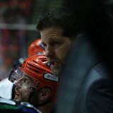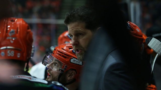 Sheffield Steelers head coach Aaron Fox speaking to Peter Spencer, after their 5-2 win over Manchester Storm.