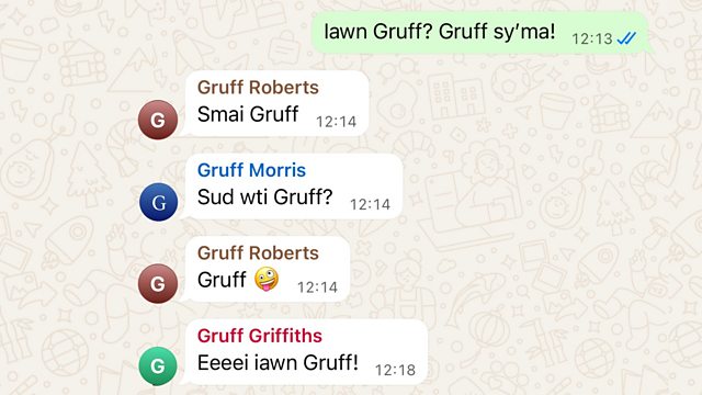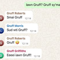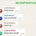 Trystan ac Emma am gefnogi Gruff Hughes i greu y grwp mwyaf o Gruff's ar Whatsapp.