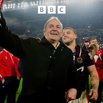 Owner Neil Hudgell talks to Richard Stead after Hull KR's World Club Challenge victory.