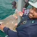 Hamza helps researchers pull up a giant fish from the depths