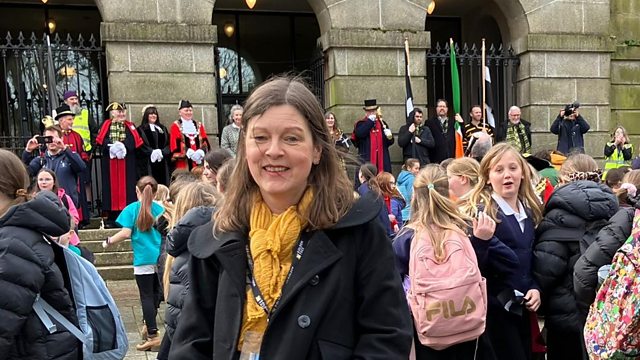 Nia Robertson a Sam Ruane-Brown yn sôn am ddathliadau Dydd Gŵyl Piran yng Nghernyw.