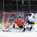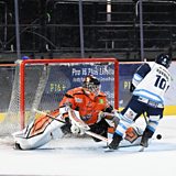 Sheffield Steelers netminder Eamon McAdam speaking to Peter Spencer, after their 4-3 penalty shot win over Covetry Blaze.
