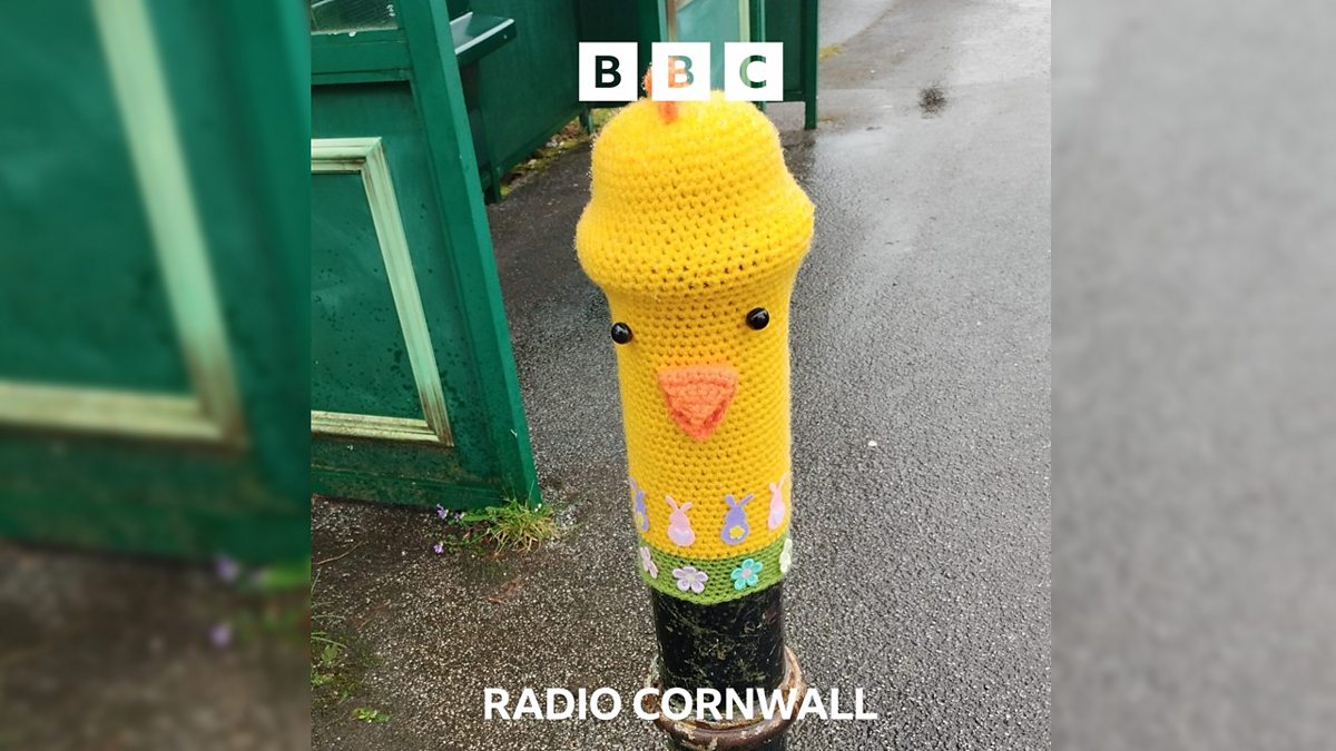 Neil Caddy speaks to Joy and Leslie after knitted bollard covers were taken in Carnon Downs.