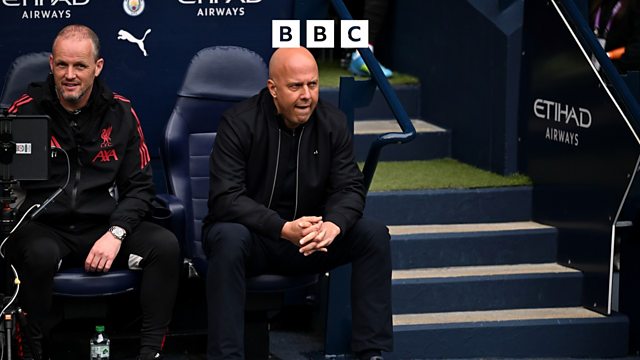 Liverpool head coach Arne Slot reacts to his side's 4-0 defeat at Manchester City in the FA Cup quarter-finals. The Reds go to Paris Saint-Germain in the Champions League on Wednesday