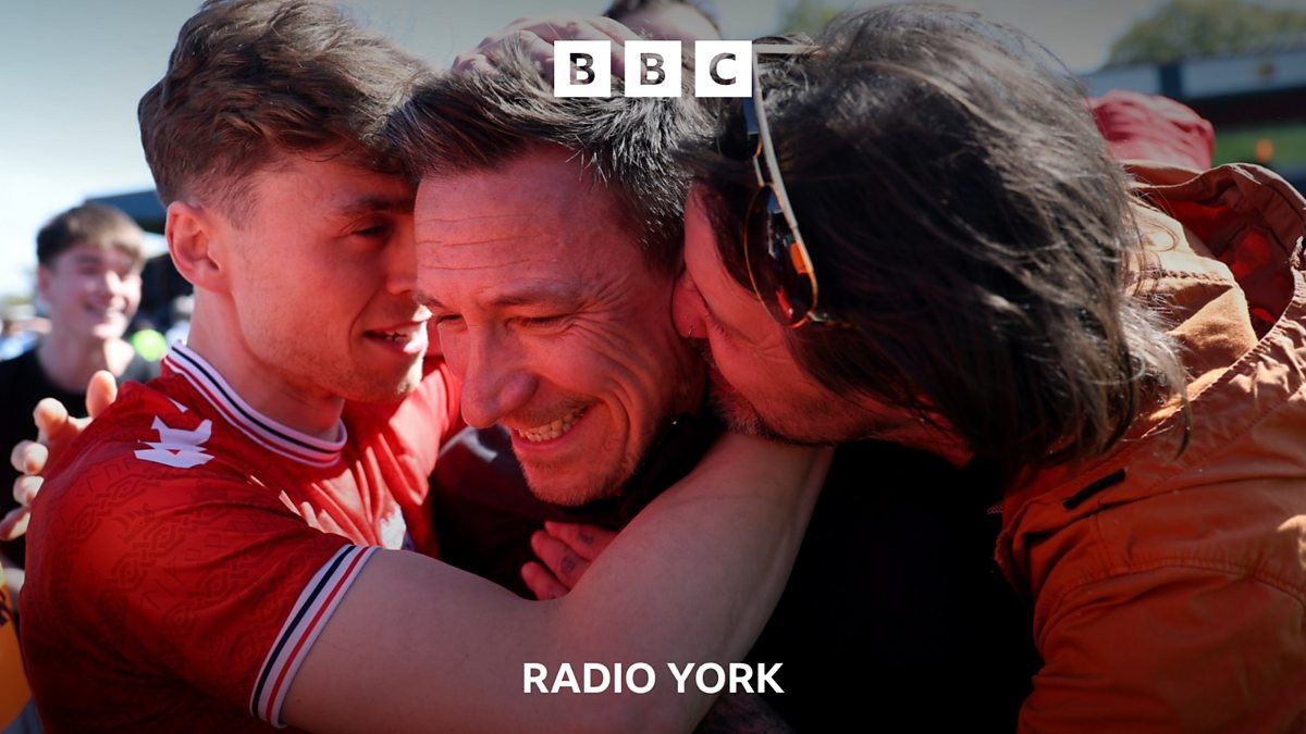 Manager Stuart Maynard, speaking to BBC Radio York's David Ward, reacts after York City win the National League and achieve promotion to the Football League following a 1-1 draw away at title rivals Rochdale.