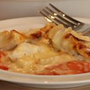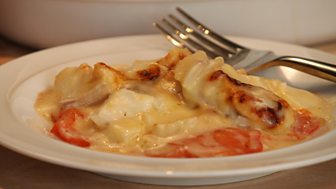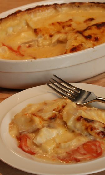 4. Place the sliced tomatoes into the base of a large ovenproof dish, flake the fish oven the tomatoes, removing any skin and bones,