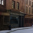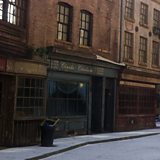 A number of new sets were built in rooms of the castle. The first was the interior of the Three Crowns Tavern, a small but jewel-like set where we built a Victorian bar and old oak settles surrounded by stained glass screens to create a warm, glowing space where the shop staff could meet.