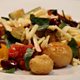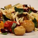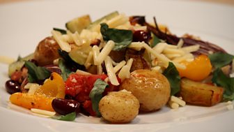 4. Place in the hot oven and, once the vegetables have started to colour, add the tomatoes and basil. Mix well and return to the oven for a further 20 minutes or so, until the vegetables are well coloured, but are still reasonably crunchy in texture.