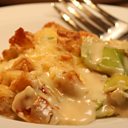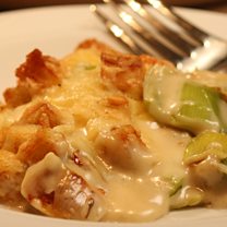 3. Pour the bechamel sauce over the top of the leeks and onions
