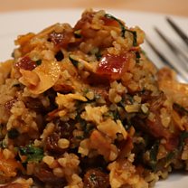 2 Add the diced red onion, almonds, sultanas, lemon juice, olive oil and herbs and mix well.