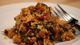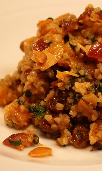1 For the tabbouleh, place the bulgar wheat, harissa and ras a hanout into a pan. Cover with the boiling hot stock. Cover the pan with a lid or cling film and leave for 20 minutes.