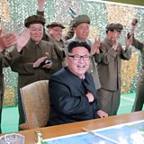 Picture: An undated picture from North Korea's official news agency showing leader Kim Jong-un (centre) inspecting a test of a long-range strategic ballistic missile. Credit: KCNA / AFP / Getty Images.