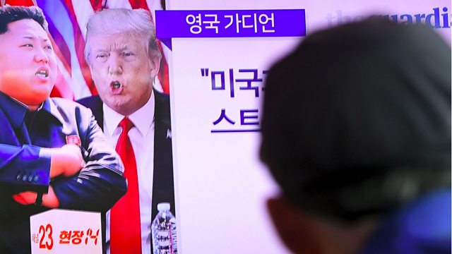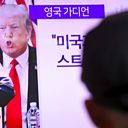 (Image: A man a television news programme showing US President Donald Trump and North Korean leader Kim Jong-Un at a railway station in Seoul on 9th August 2017. Credit: Jung Yeon-Je/AFP/Getty Images)