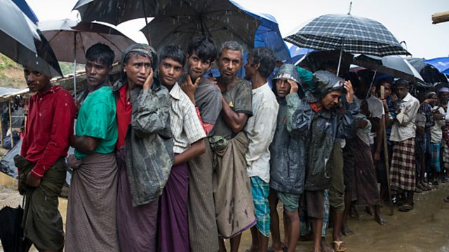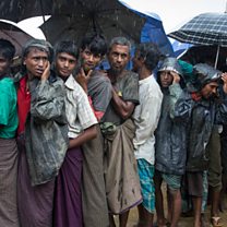 (Photo: Rohingya men wait in line for UNHCR distribution at the Kutupalong camp in Bangladesh Credit: Paula Bronstein/Getty Images)