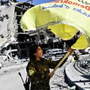 (Photo: Rojda Felat, a Syrian Democratic Forces (SDF) commander, waves her group's flag at the iconic Al-Naim square in Raqa on October 17, 2017. Credit: BULENT KILIC/AFP/Getty Images)