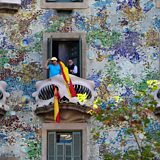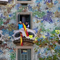 Picture: People wave Spanish flags from the Casa Batllo during a pro-unity demonstration in Barcelona. Credit: Pierre-Philippe Marcou/AFP/Getty Images)