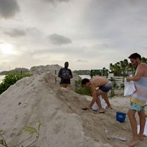 (Photo: Employees of Mercure Hotel on the Caribbean island of Saint-Martin fill sand bags in preparation for Hurricane Irma, 5 September 2017. Credit: Lionel Chamoiseu/AFP/Getty Images)