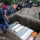 (Photo: Caskets of earthquake victims are arranged in a grave, in Atzala, Mexico.