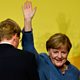 (Photo: German Chancellor and Christian Democrat (CDU) Angela Merkel reacts to initial results that give the party 33% of the vote. Credit: Getty Images)