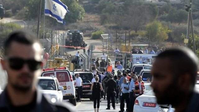(Photo: Israeli security forces and emergency services gather at the scene of the shooting attack in the West Bank. Credit: EPA)