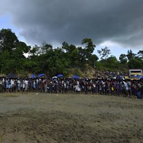 (Photo: Rohingya refugees wait in line for food to be distributed at the Balukhali refugee camp near Gumdhum on September 25, 2017. Credit: Dominique Faget/AFP/Getty Images)