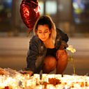 (Photo: Woman lights a candle during vigil in Las Vegas; Credit: Reuters)
