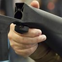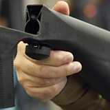 (Photo: A bump stock device that fits on a semi-automatic rifle to increase the firing speed, Credit: George Frey/Getty Images)