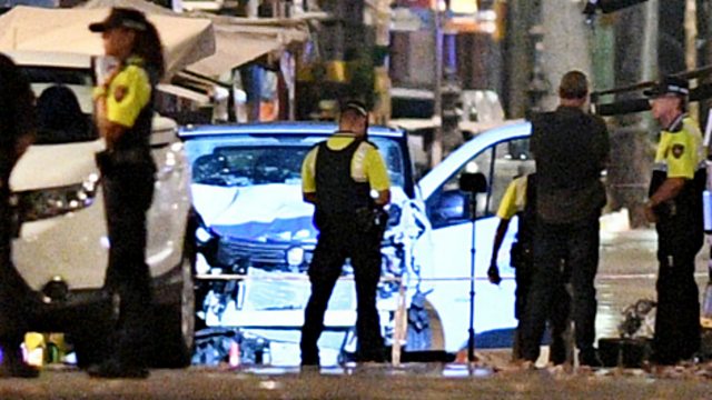 (Image: A damaged van, believed to be the one used in the attack, is surrounded by police officers in the Las Ramblas area on 17th August 2017 in Barcelona, Spain. Credit: David Ramos/Getty Images)
