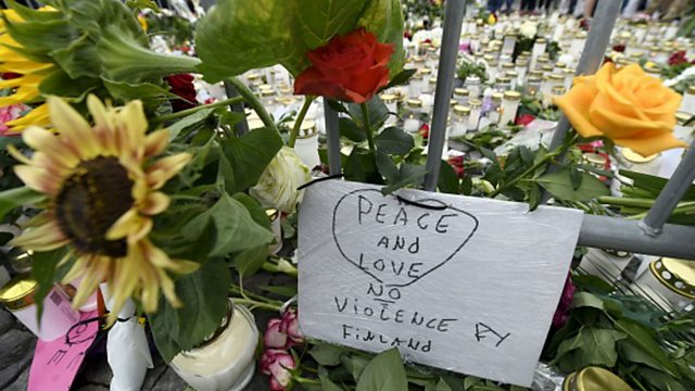 (Image: Candles and flowers at a memorial for the victims of Friday's stabbings at the Turku Market Square, Finland on 19th August 2017. Credit: Vesa Moilanen/AFP/Getty Images)