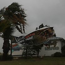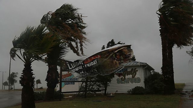 (Image: A sign blows in the wind after being partially torn from its frame by winds from Hurricane Harvey on 25th August 2017 in Corpus Christi, Texas. Credit: Joe Raedle/Getty Images)