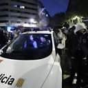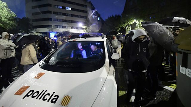 (Images: Catalan police sit in their patrol car as people gather outside a polling station in Figueras, Spain. Credit: Getty Images)