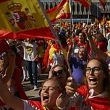 (Image : Demonstrators shout slogans and hold Spanish flags as they protest against the independence of Catalonia. Credit: Pablo Blazquez Dominguez/Getty Images)