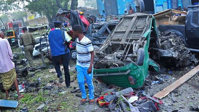 (Image: People stand at the scene of a blast after two car bombs exploded in Mogadishu. Credit: Getty Images)