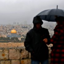 Photo: People stand at Mount of Olives and look at the Old City of Jerusalem and its Dome of the Rock mosque in the centre, on December 6, 2017. Credit: Ahmad Gharabli/AFP/Getty Images)
